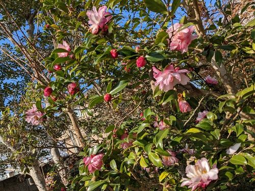 11月下旬の実家のお花です。 山茶花。とてもかわいいです。 はるか昔、大川栄策さんのサザンカの宿を父が練習していたので、私もいつも歌ってました 難しかったのを覚えています。今でも歌えますね、きっと。 薔薇、屋根まで届きそう、鉢底を破り根を張っ…